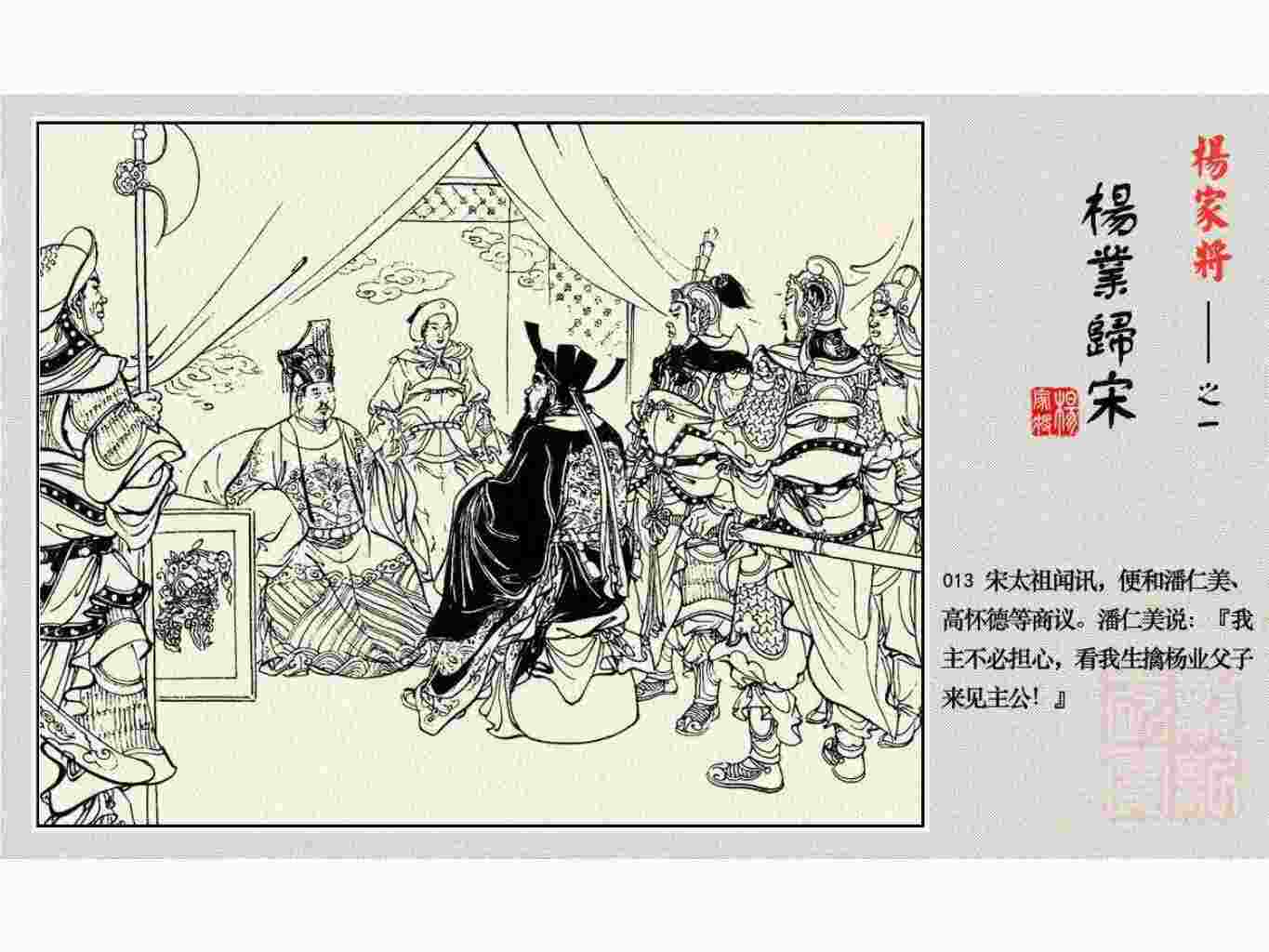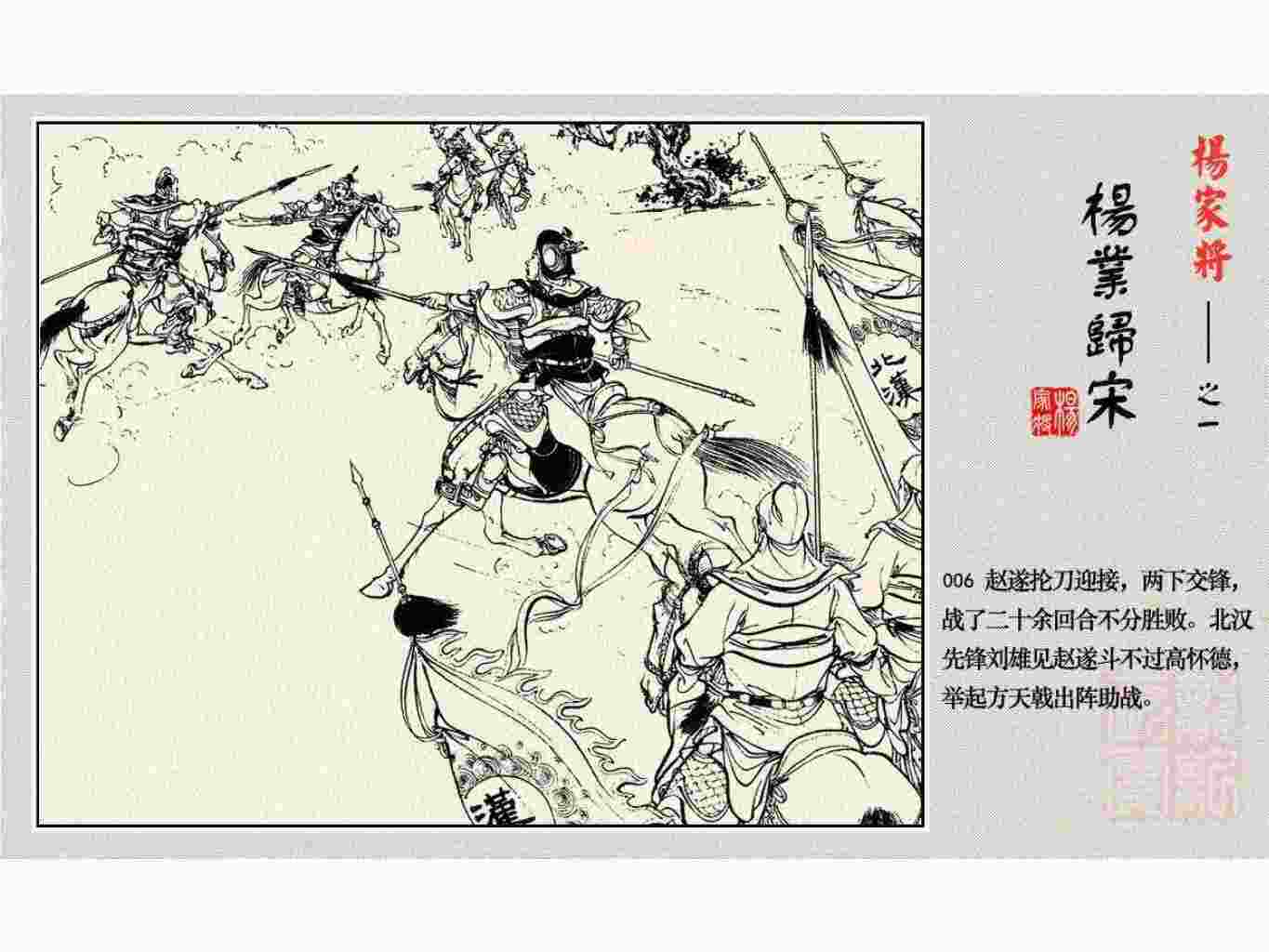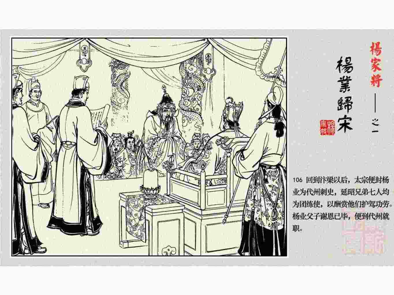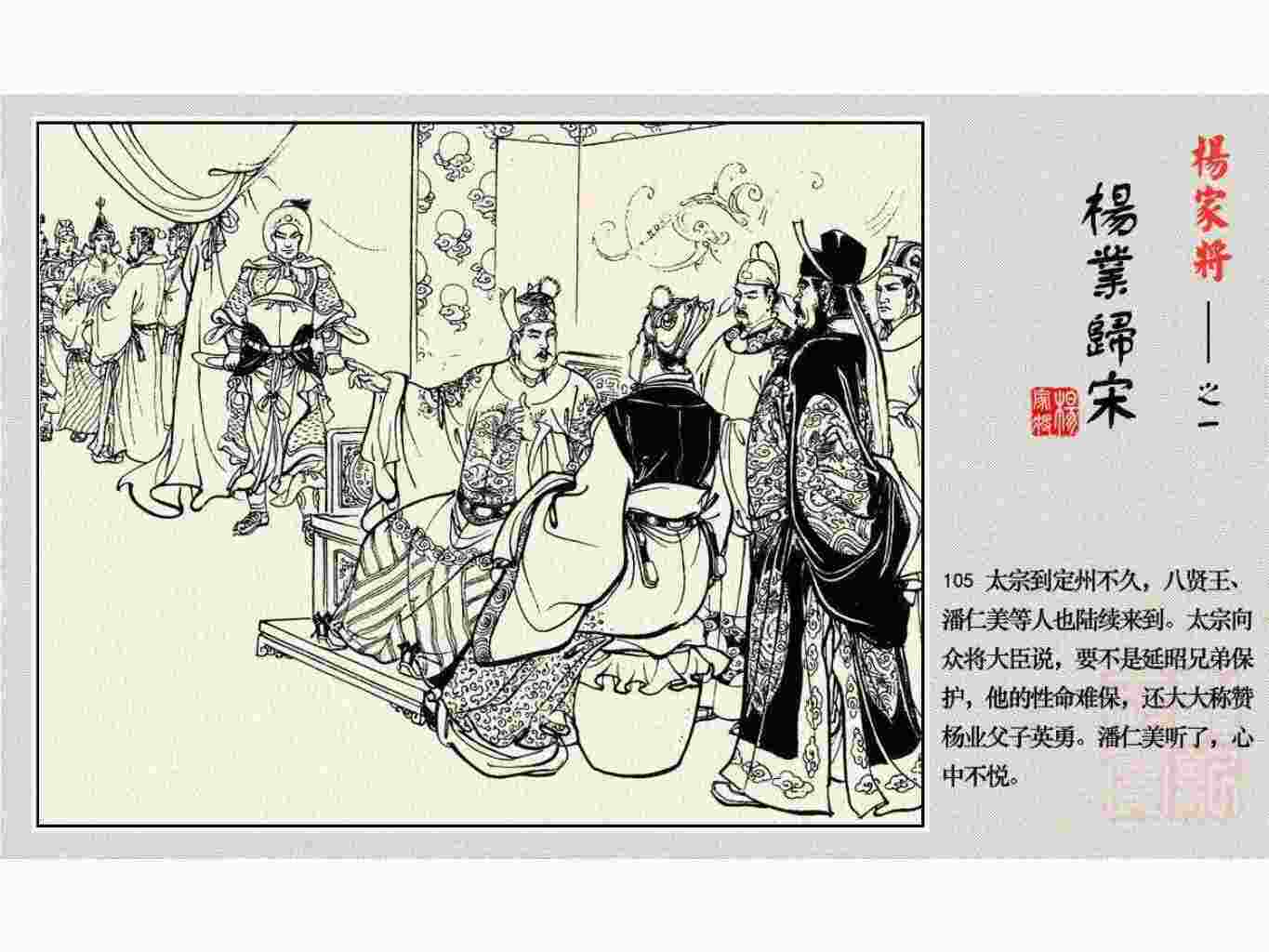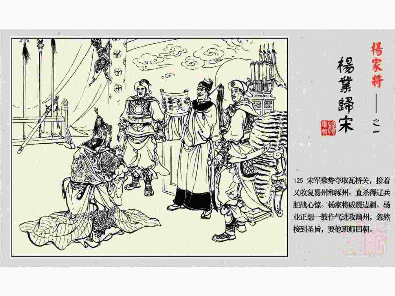 这套连环画是根据《北宋杨家将演义》和评书《杨家将》,并参考《宋史》中杨业、杨延昭、潘美等人传记,及京剧和地方戏曲改编的。全书分为五集。本集《杨业归宋》:杨业原是北汉王刘钧部下的武将,曾和宋朝作战。刘钩听信宠臣的谗言,对杨业不予重用,而宋太宗却十分赏识杨业父子,派人劝说杨业归宋。最后杨业父子弃暗投明,归顺宋朝。下集《杨七郎打播》,讲潘仁美的儿子潘豹立插台仗势欺人,杨业之子杨延嗣打死潘豹,潘、杨两家结怨。本书1958年2月由朝花美术出版社首次出版,现经修订,重新出版。