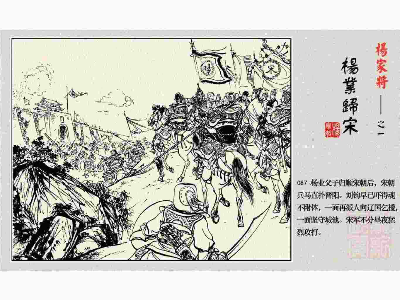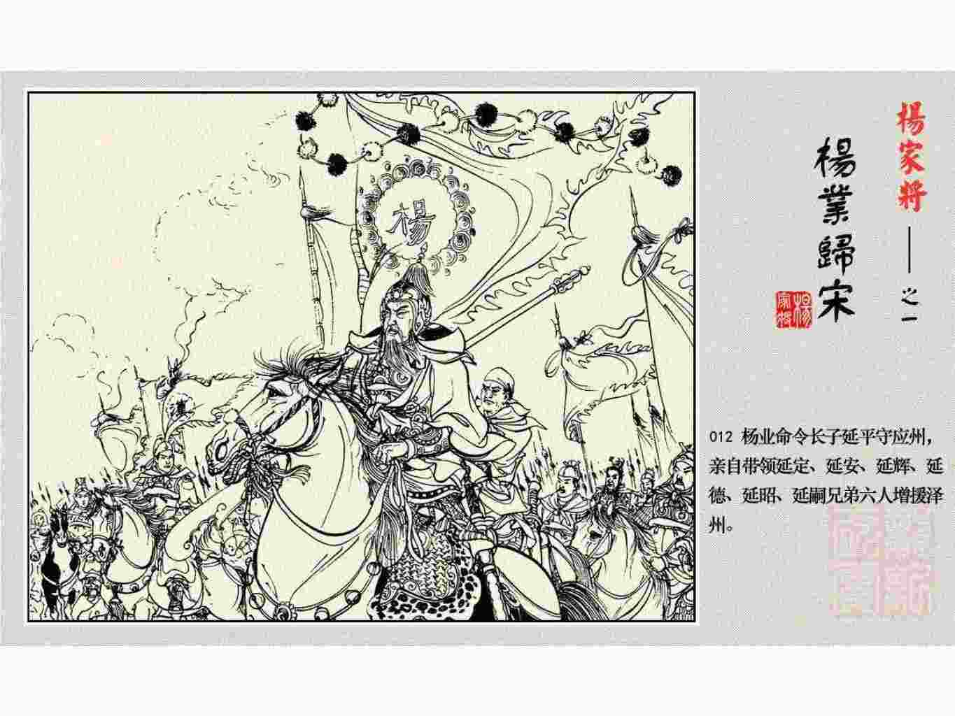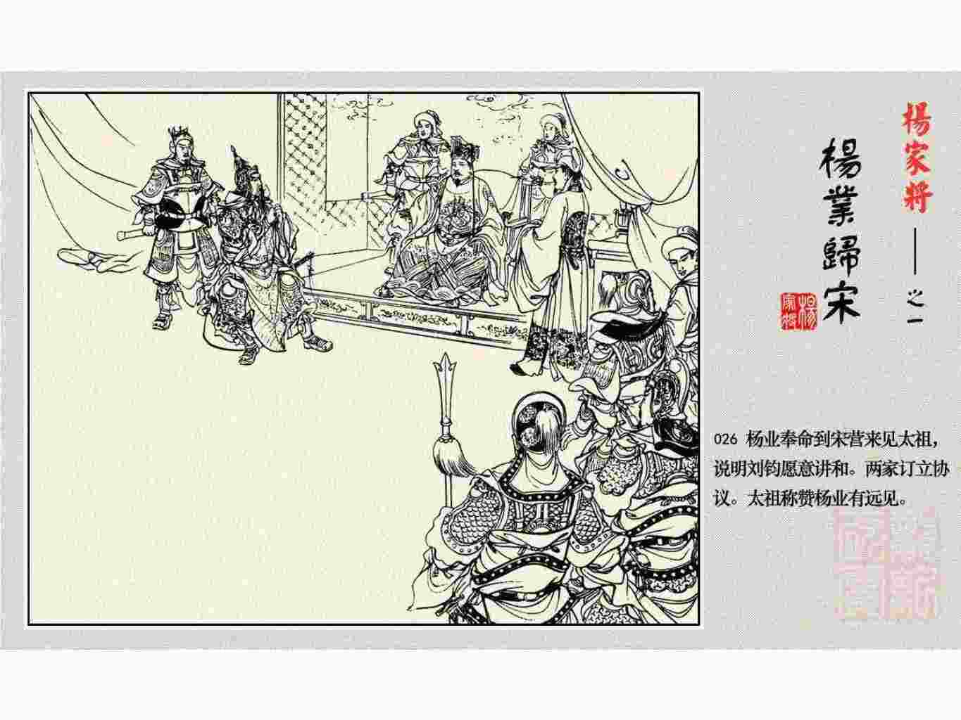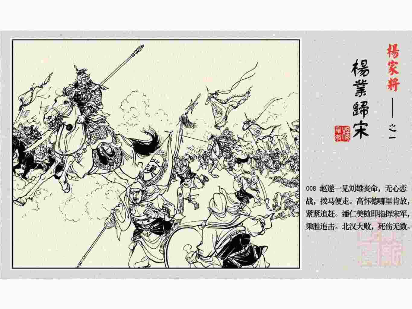 这套连环画是根据《北宋杨家将演义》和评书《杨家将》,并参考《宋史》中杨业、杨延昭、潘美等人传记,及京剧和地方戏曲改编的。全书分为五集。本集《杨业归宋》:杨业原是北汉王刘钧部下的武将,曾和宋朝作战。刘钩听信宠臣的谗言,对杨业不予重用,而宋太宗却十分赏识杨业父子,派人劝说杨业归宋。最后杨业父子弃暗投明,归顺宋朝。下集《杨七郎打播》,讲潘仁美的儿子潘豹立插台仗势欺人,杨业之子杨延嗣打死潘豹,潘、杨两家结怨。本书1958年2月由朝花美术出版社首次出版,现经修订,重新出版。