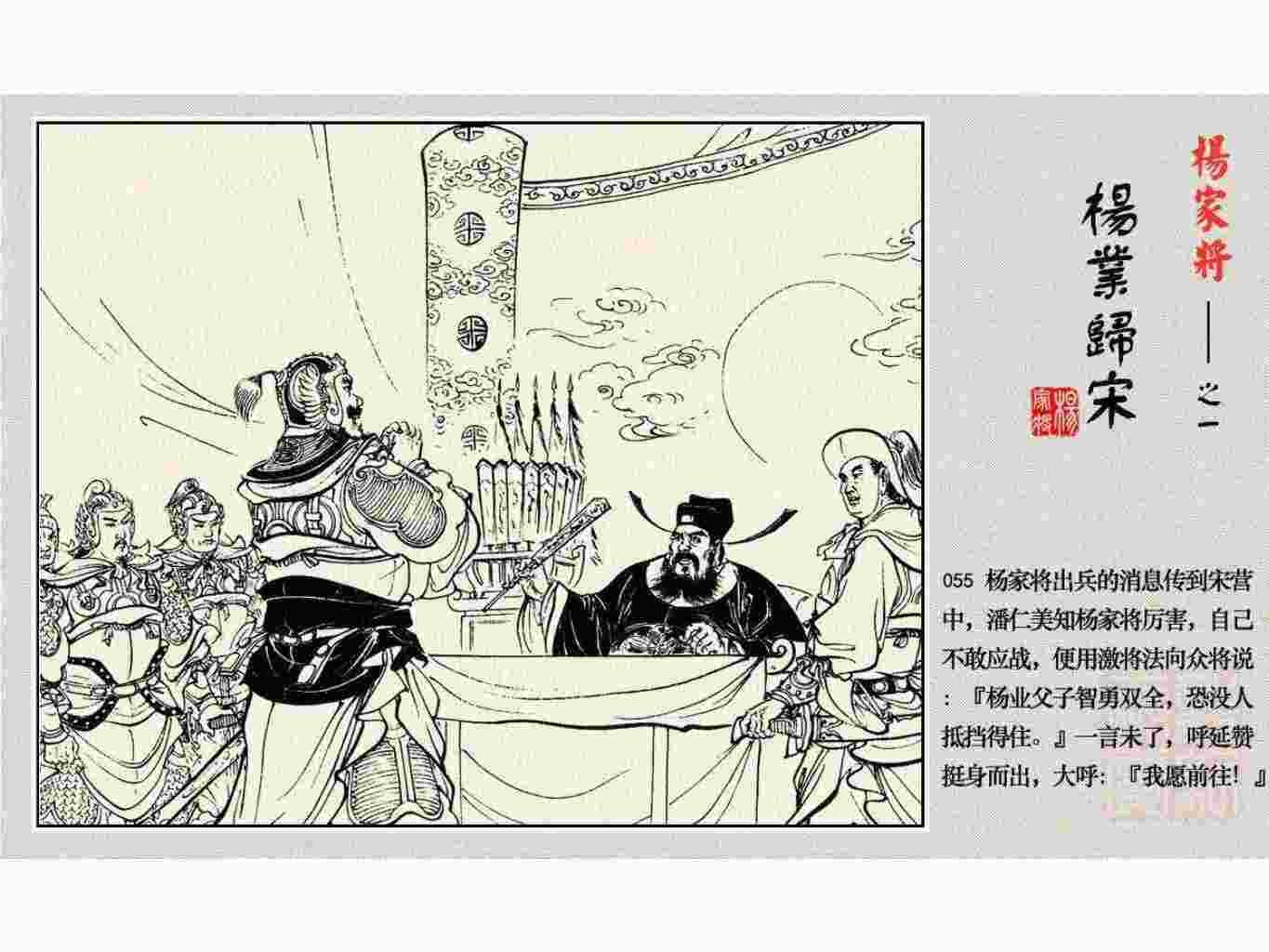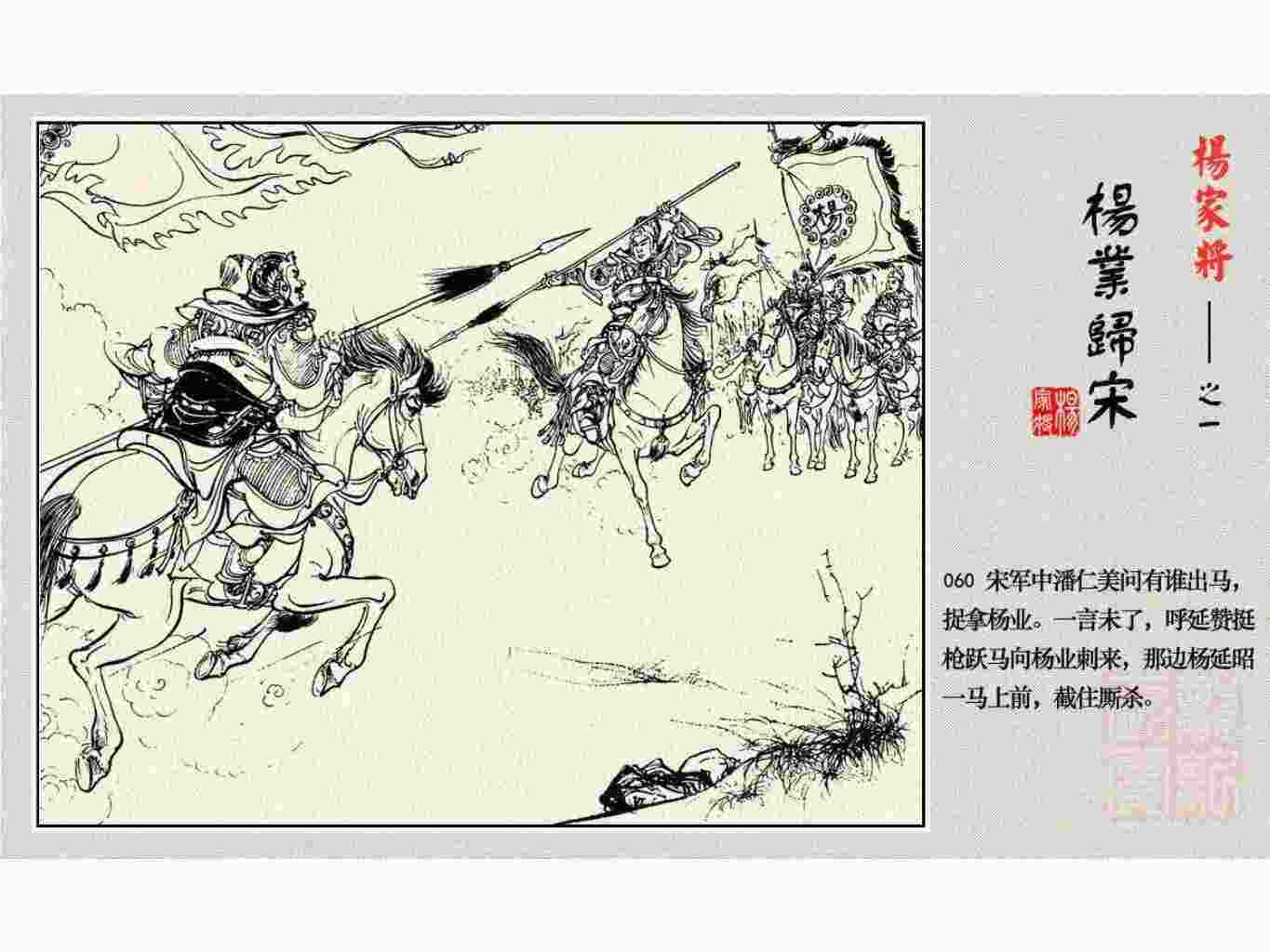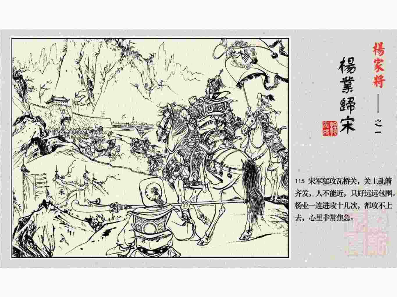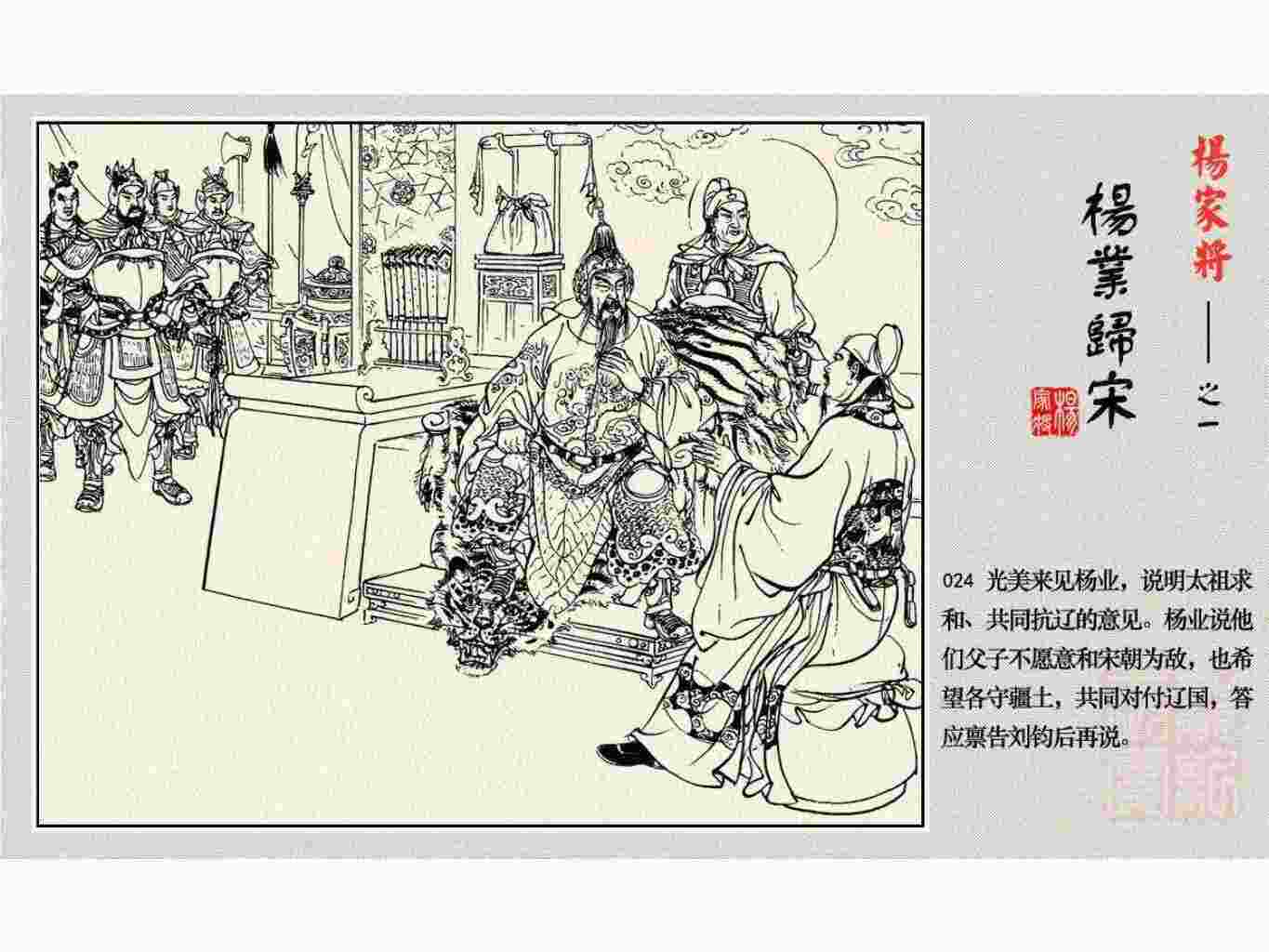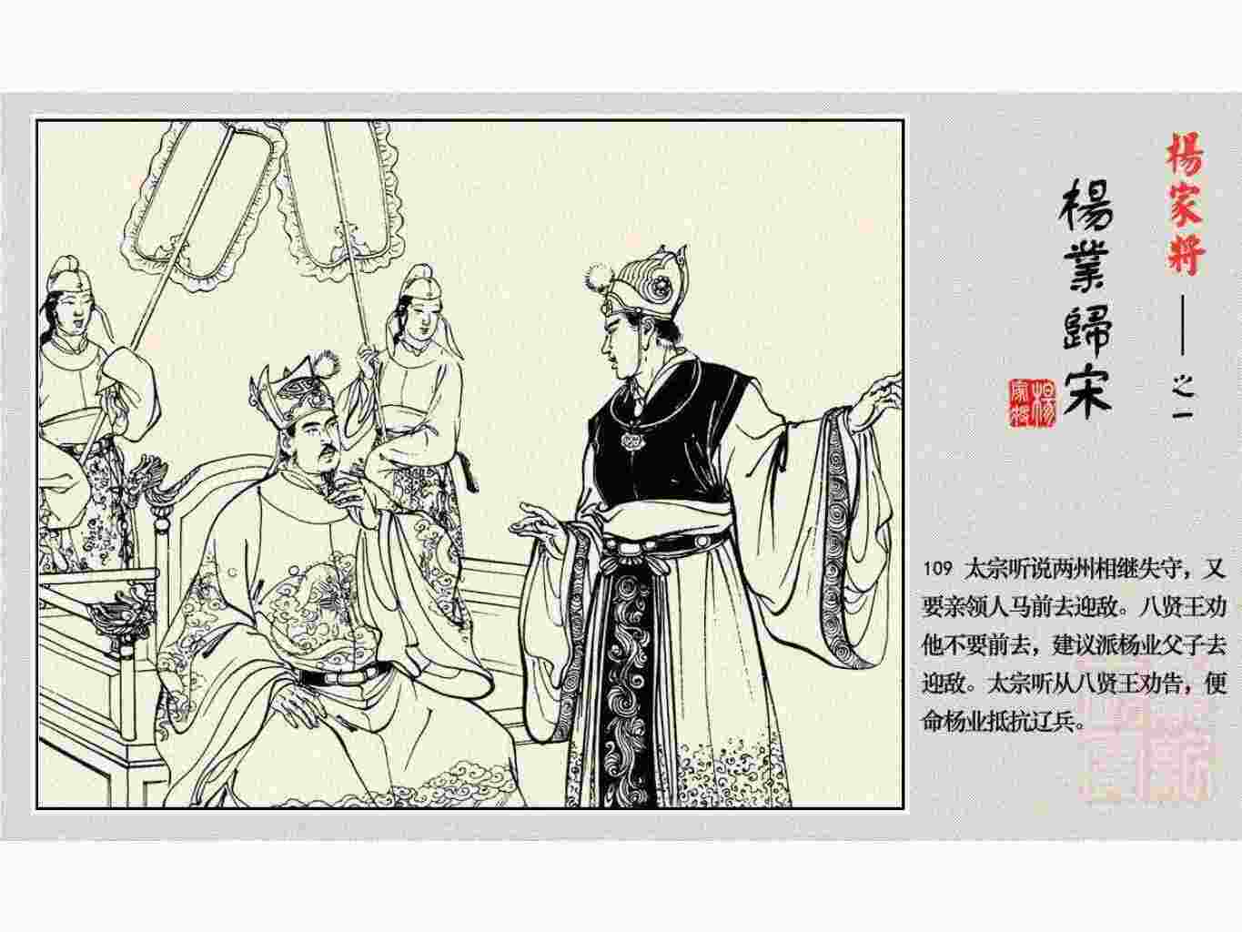 这套连环画是根据《北宋杨家将演义》和评书《杨家将》,并参考《宋史》中杨业、杨延昭、潘美等人传记,及京剧和地方戏曲改编的。全书分为五集。本集《杨业归宋》:杨业原是北汉王刘钧部下的武将,曾和宋朝作战。刘钩听信宠臣的谗言,对杨业不予重用,而宋太宗却十分赏识杨业父子,派人劝说杨业归宋。最后杨业父子弃暗投明,归顺宋朝。下集《杨七郎打播》,讲潘仁美的儿子潘豹立插台仗势欺人,杨业之子杨延嗣打死潘豹,潘、杨两家结怨。本书1958年2月由朝花美术出版社首次出版,现经修订,重新出版。