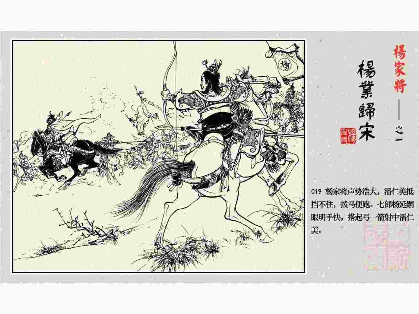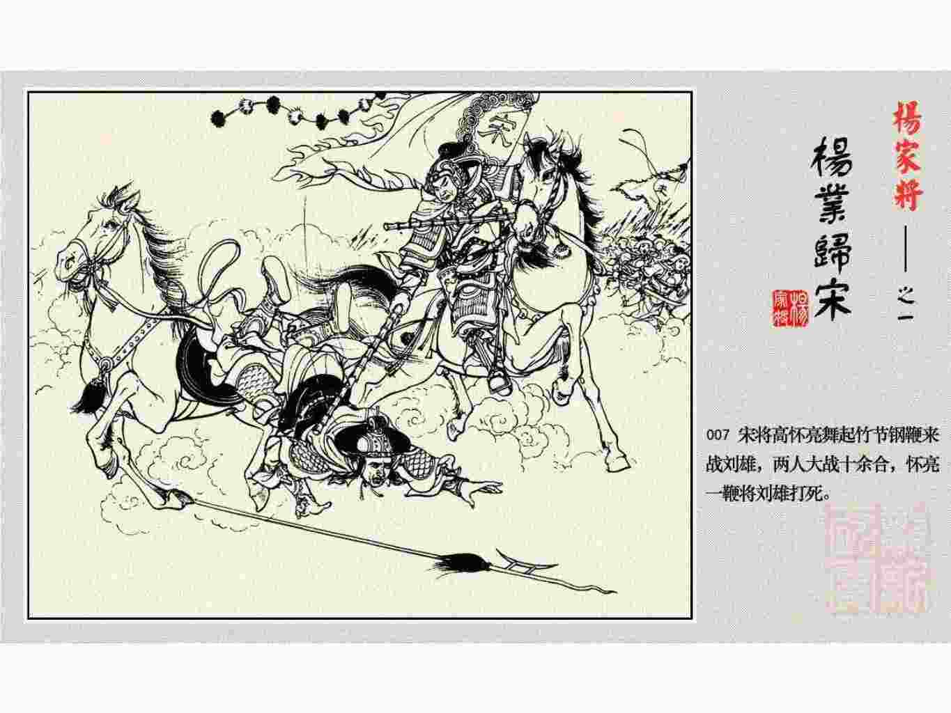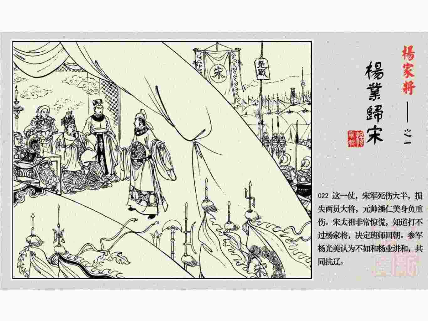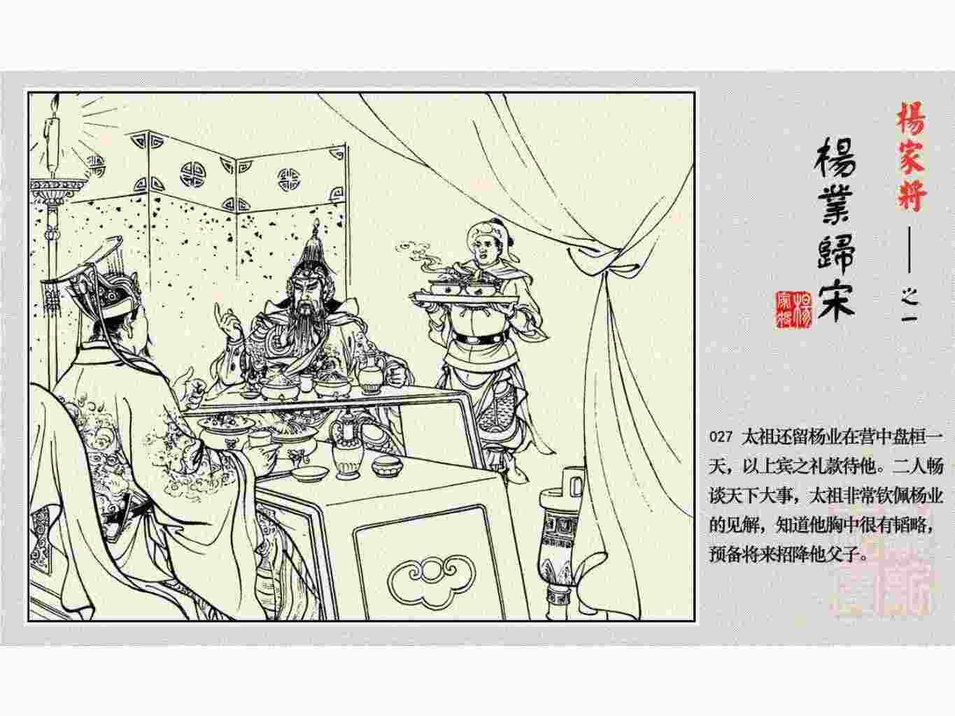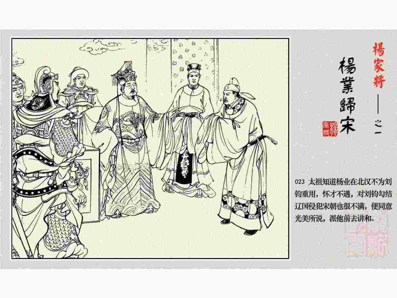 这套连环画是根据《北宋杨家将演义》和评书《杨家将》,并参考《宋史》中杨业、杨延昭、潘美等人传记,及京剧和地方戏曲改编的。全书分为五集。本集《杨业归宋》:杨业原是北汉王刘钧部下的武将,曾和宋朝作战。刘钩听信宠臣的谗言,对杨业不予重用,而宋太宗却十分赏识杨业父子,派人劝说杨业归宋。最后杨业父子弃暗投明,归顺宋朝。下集《杨七郎打播》,讲潘仁美的儿子潘豹立插台仗势欺人,杨业之子杨延嗣打死潘豹,潘、杨两家结怨。本书1958年2月由朝花美术出版社首次出版,现经修订,重新出版。