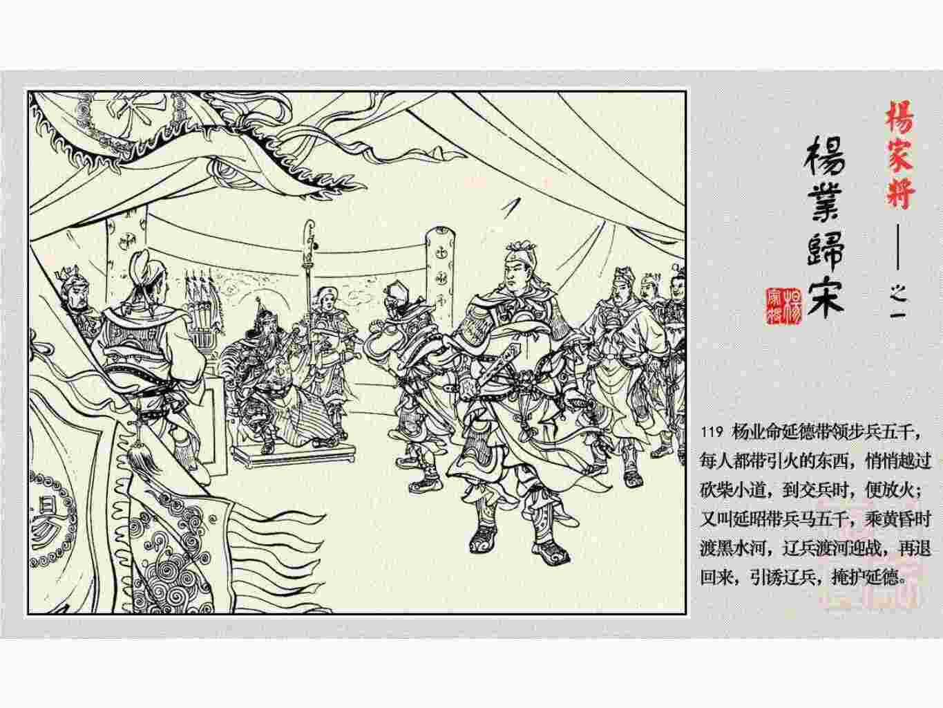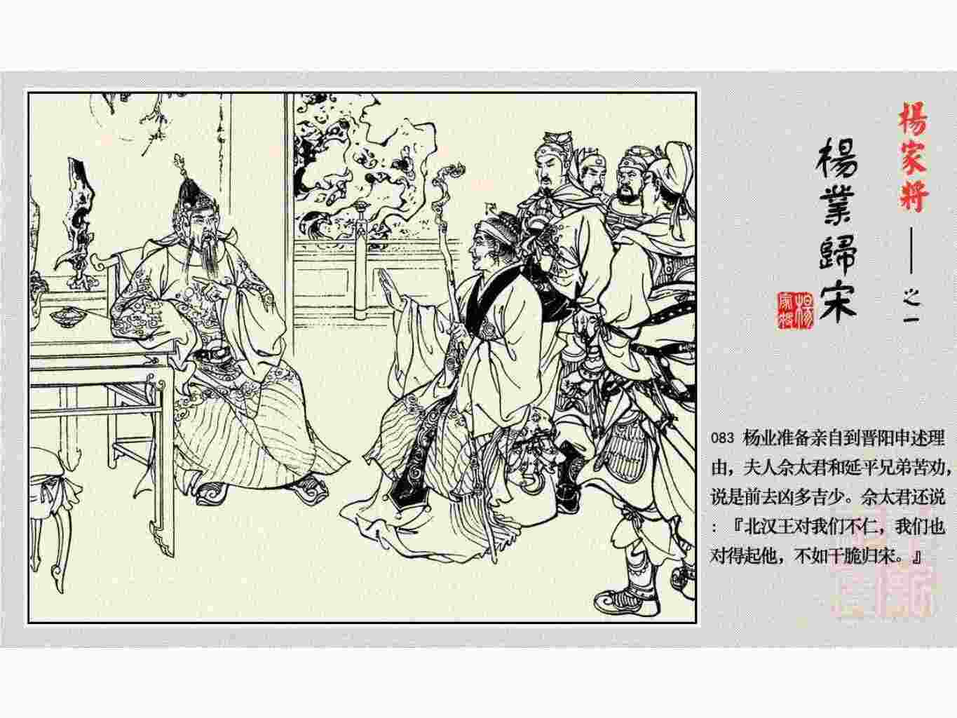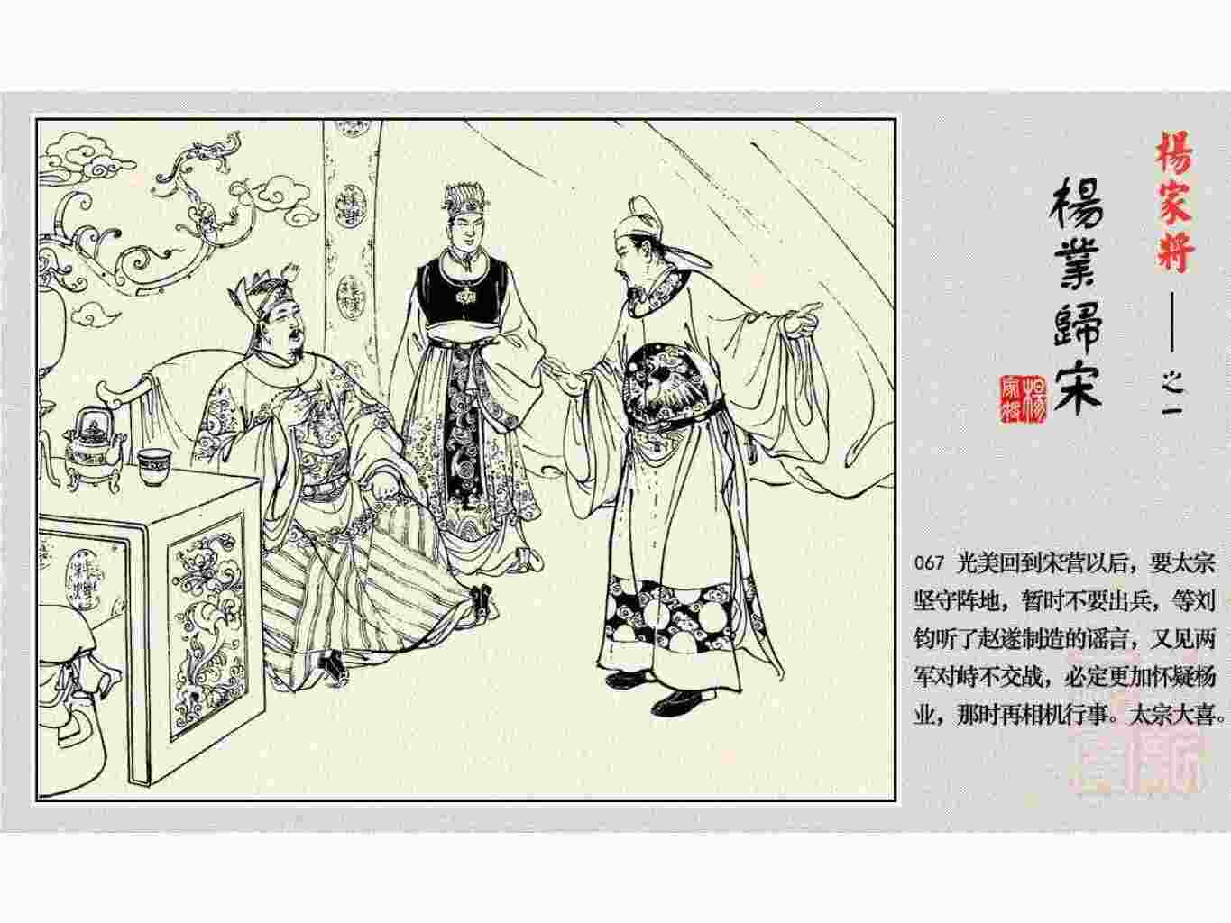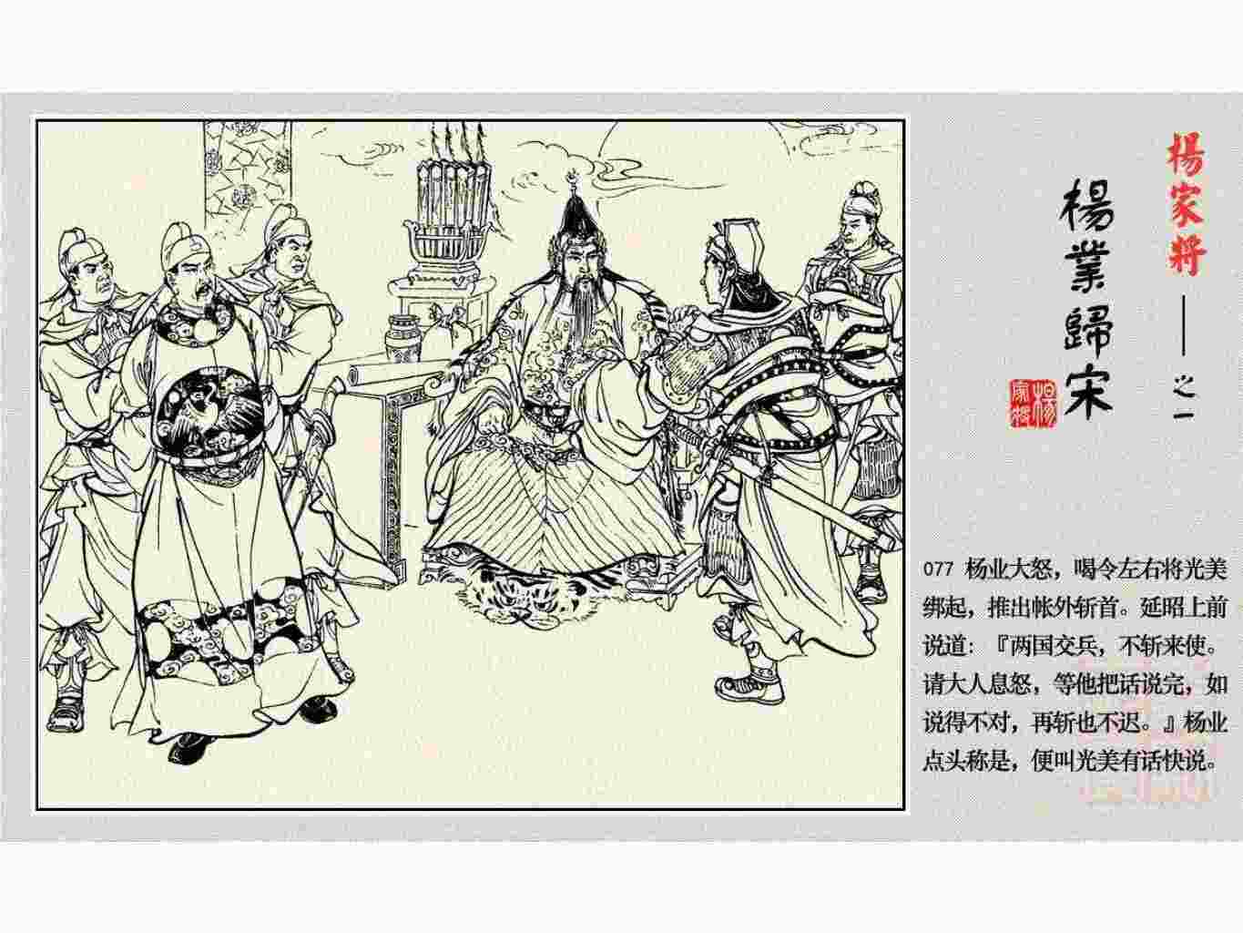 这套连环画是根据《北宋杨家将演义》和评书《杨家将》,并参考《宋史》中杨业、杨延昭、潘美等人传记,及京剧和地方戏曲改编的。全书分为五集。本集《杨业归宋》:杨业原是北汉王刘钧部下的武将,曾和宋朝作战。刘钩听信宠臣的谗言,对杨业不予重用,而宋太宗却十分赏识杨业父子,派人劝说杨业归宋。最后杨业父子弃暗投明,归顺宋朝。下集《杨七郎打播》,讲潘仁美的儿子潘豹立插台仗势欺人,杨业之子杨延嗣打死潘豹,潘、杨两家结怨。本书1958年2月由朝花美术出版社首次出版,现经修订,重新出版。