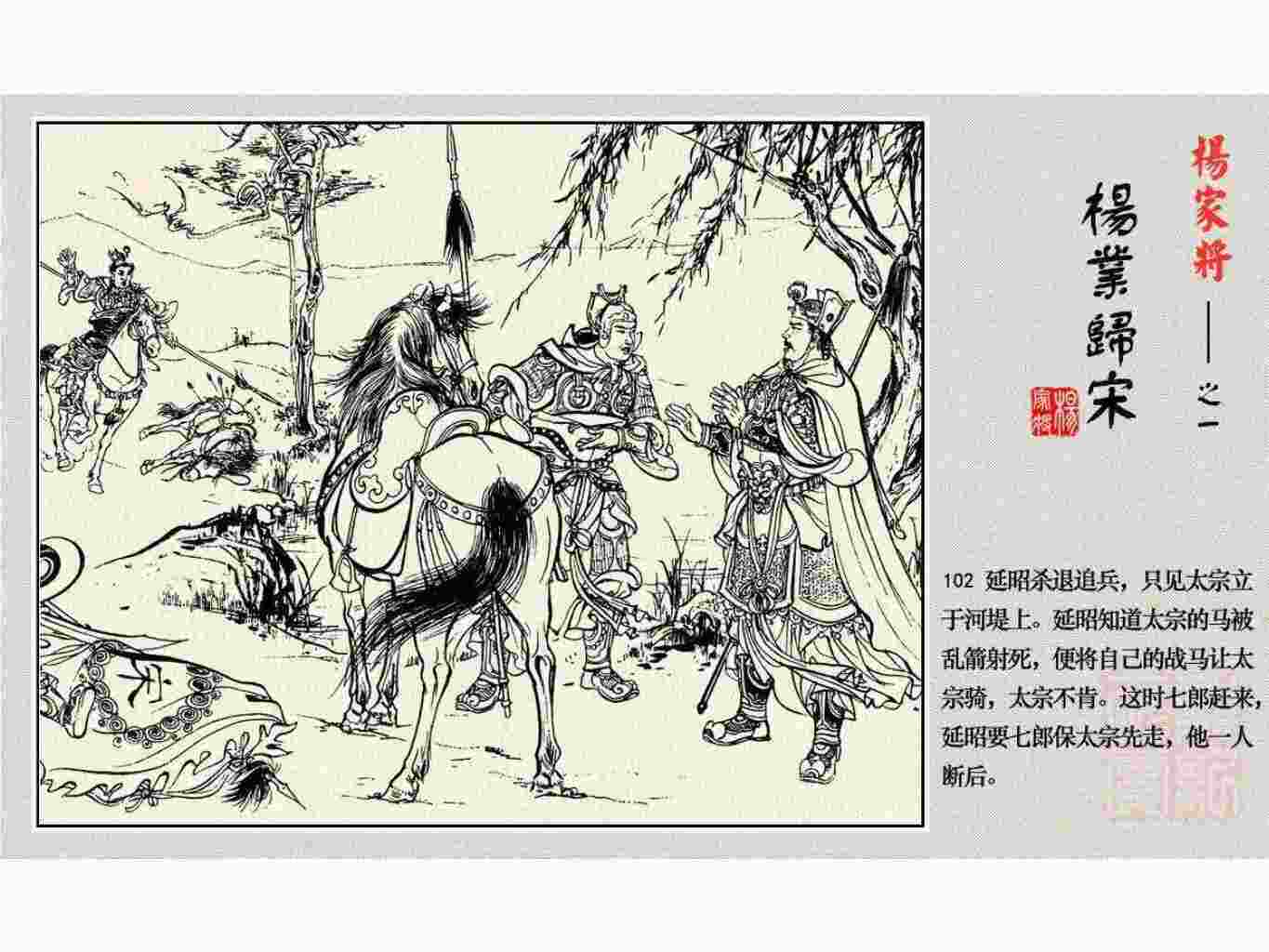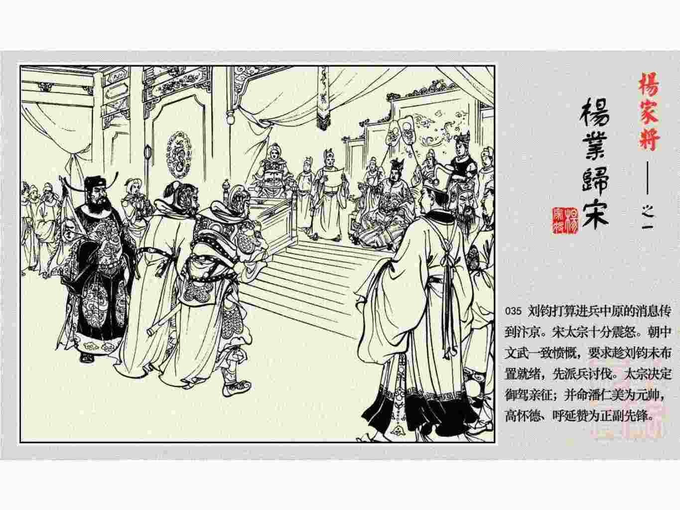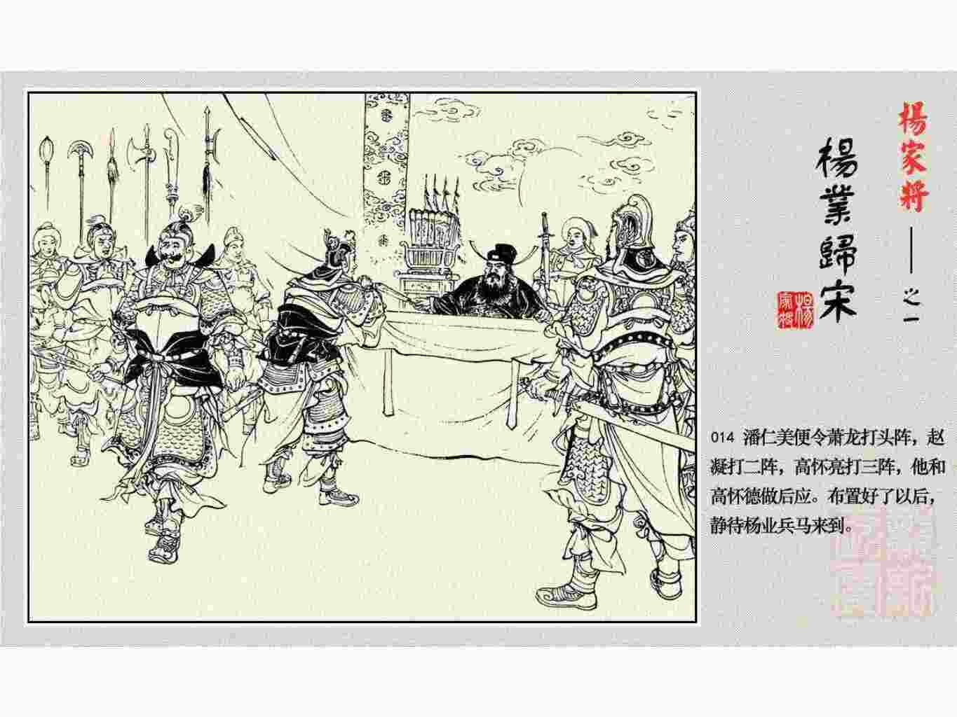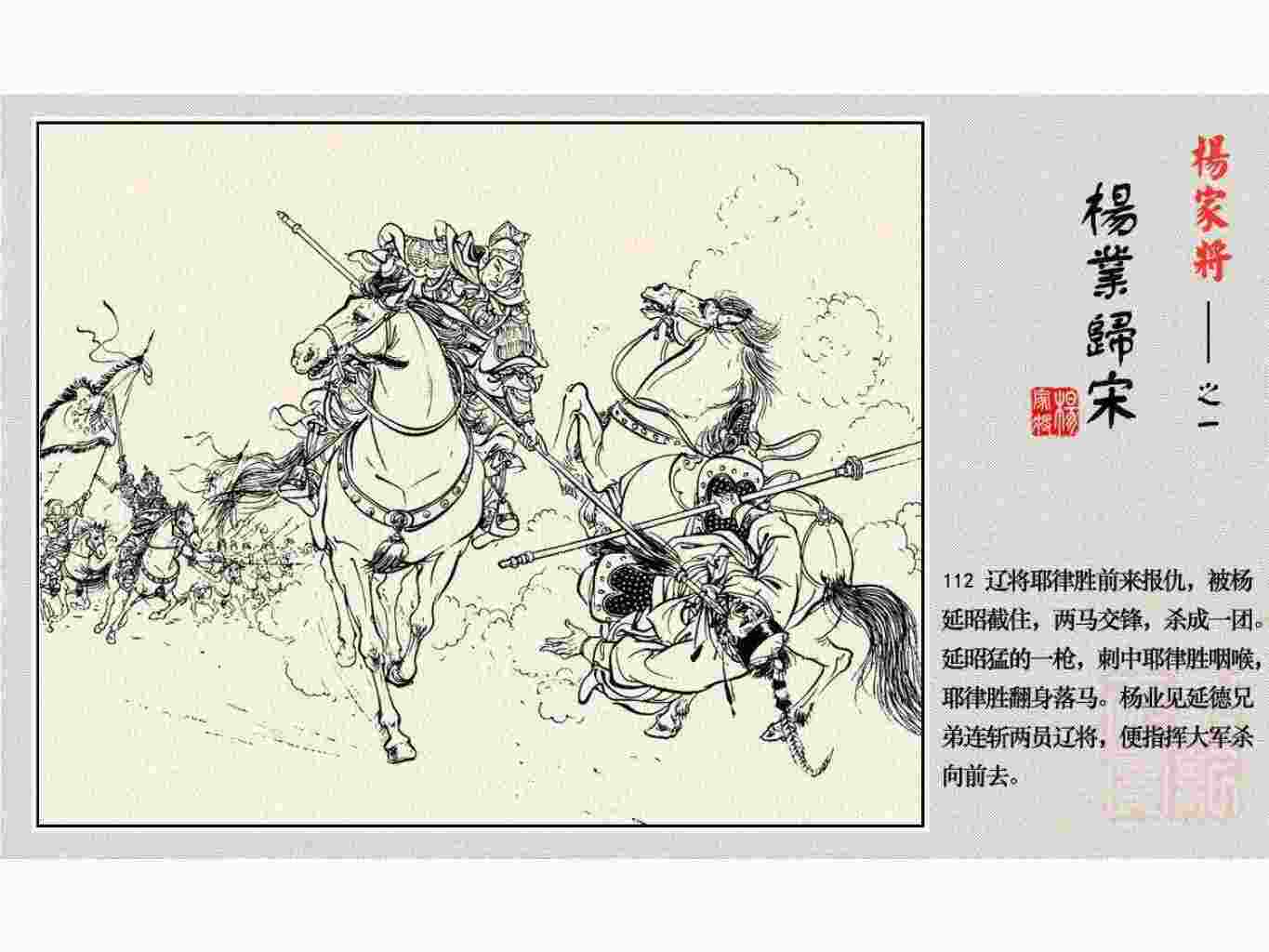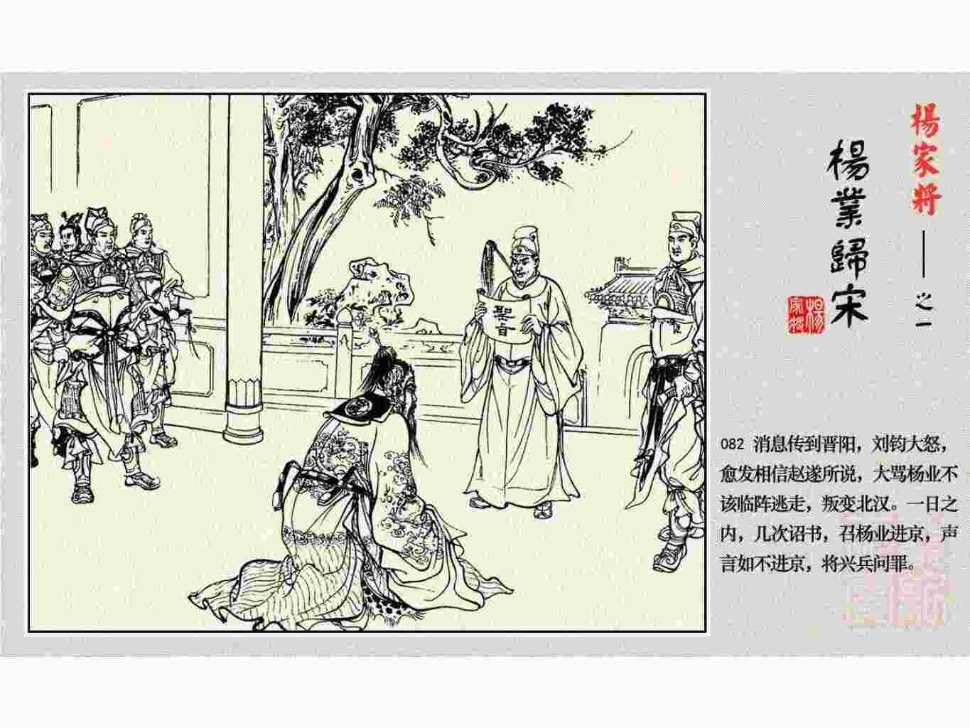 这套连环画是根据《北宋杨家将演义》和评书《杨家将》,并参考《宋史》中杨业、杨延昭、潘美等人传记,及京剧和地方戏曲改编的。全书分为五集。本集《杨业归宋》:杨业原是北汉王刘钧部下的武将,曾和宋朝作战。刘钩听信宠臣的谗言,对杨业不予重用,而宋太宗却十分赏识杨业父子,派人劝说杨业归宋。最后杨业父子弃暗投明,归顺宋朝。下集《杨七郎打播》,讲潘仁美的儿子潘豹立插台仗势欺人,杨业之子杨延嗣打死潘豹,潘、杨两家结怨。本书1958年2月由朝花美术出版社首次出版,现经修订,重新出版。