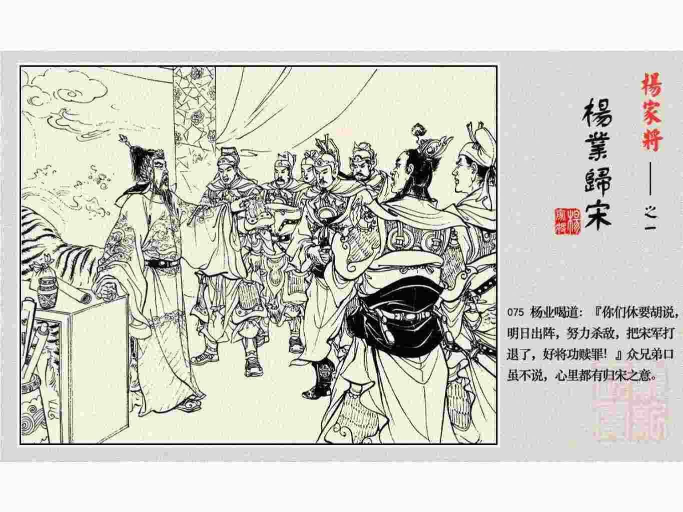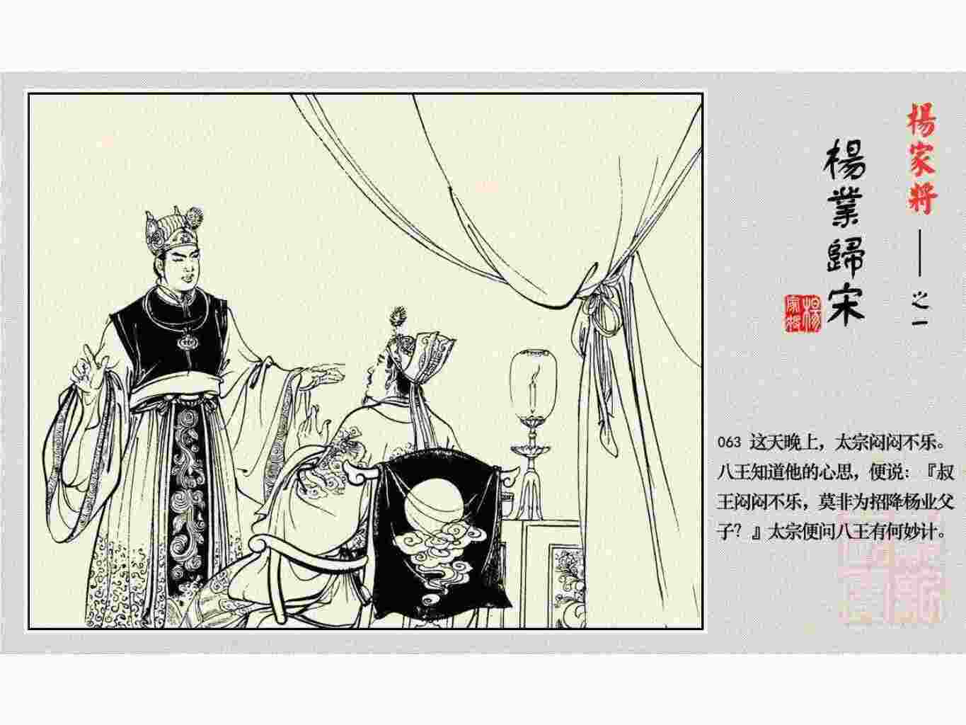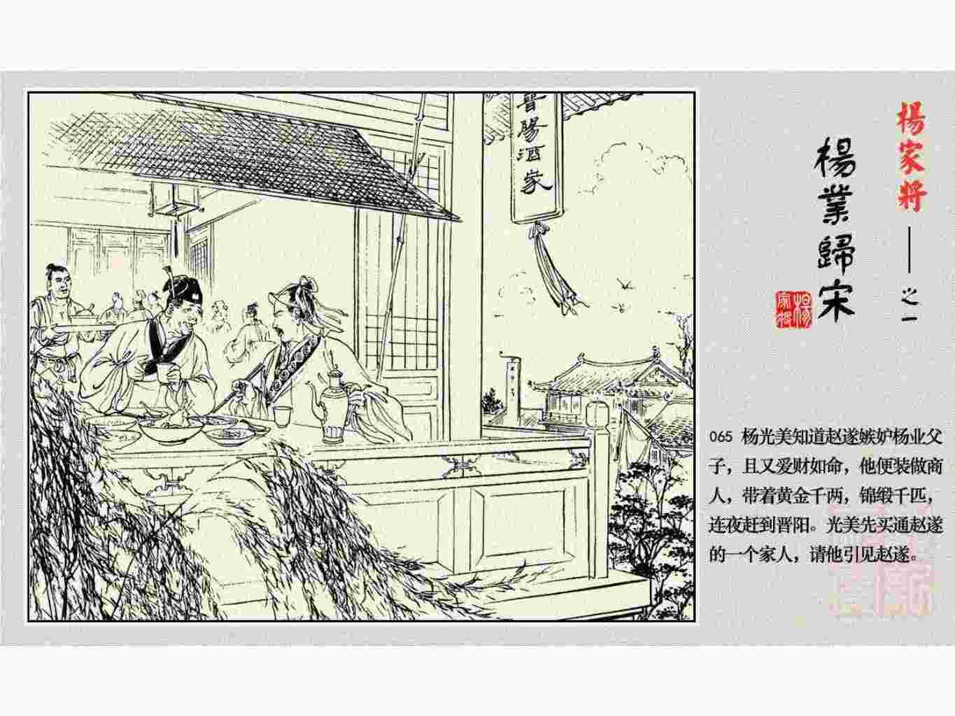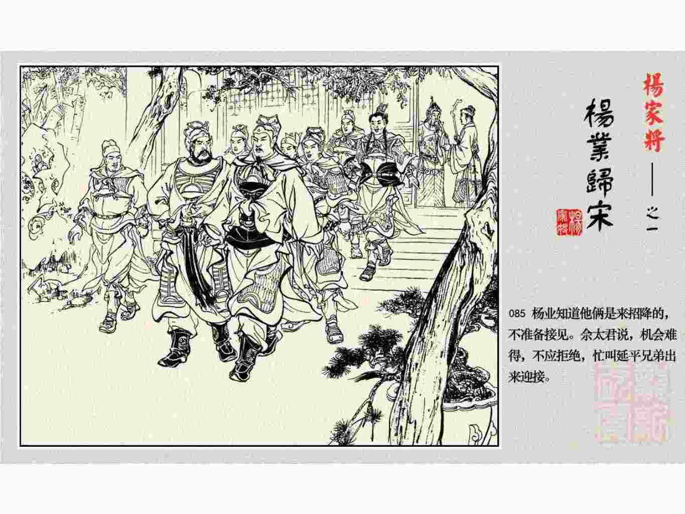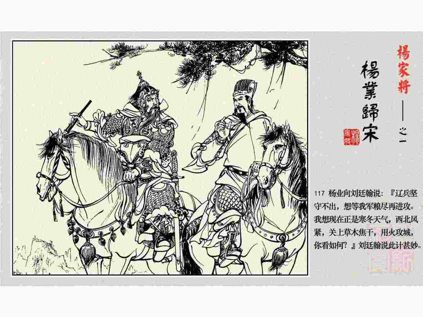这套连环画是根据《北宋杨家将演义》和评书《杨家将》,并参考《宋史》中杨业、杨延昭、潘美等人传记,及京剧和地方戏曲改编的。全书分为五集。本集《杨业归宋》:杨业原是北汉王刘钧部下的武将,曾和宋朝作战。刘钩听信宠臣的谗言,对杨业不予重用,而宋太宗却十分赏识杨业父子,派人劝说杨业归宋。最后杨业父子弃暗投明,归顺宋朝。下集《杨七郎打播》,讲潘仁美的儿子潘豹立插台仗势欺人,杨业之子杨延嗣打死潘豹,潘、杨两家结怨。本书1958年2月由朝花美术出版社首次出版,现经修订,重新出版。