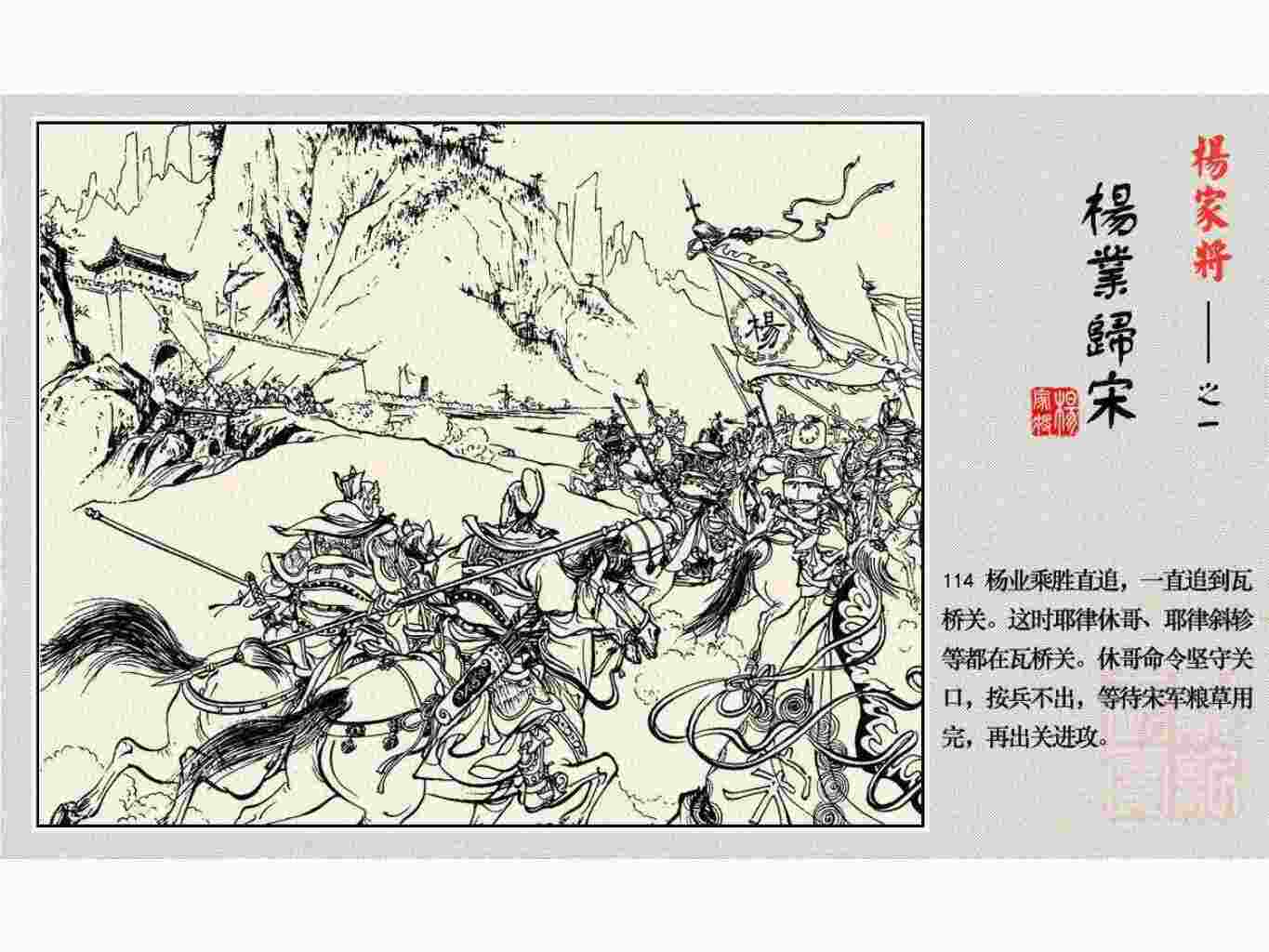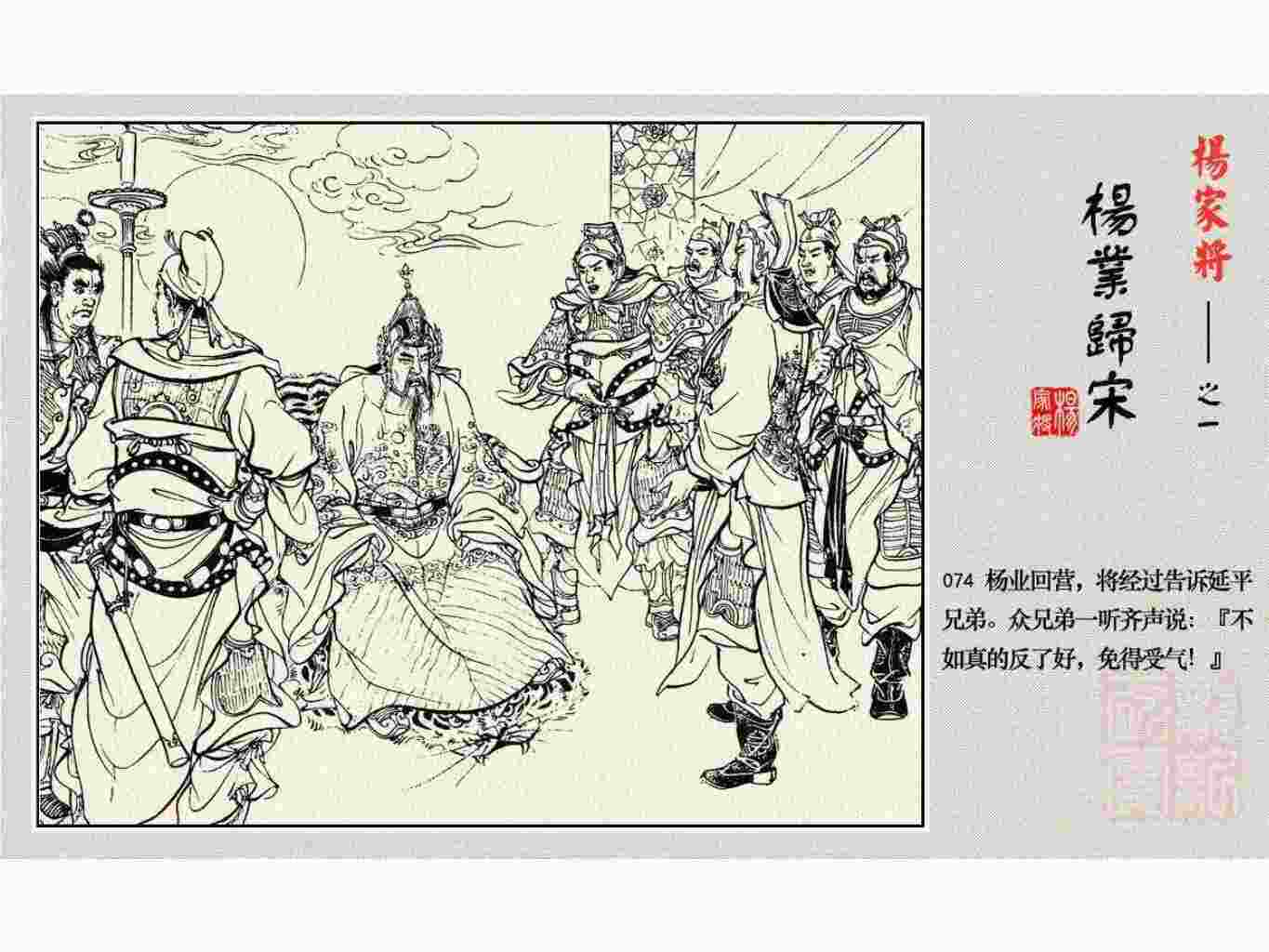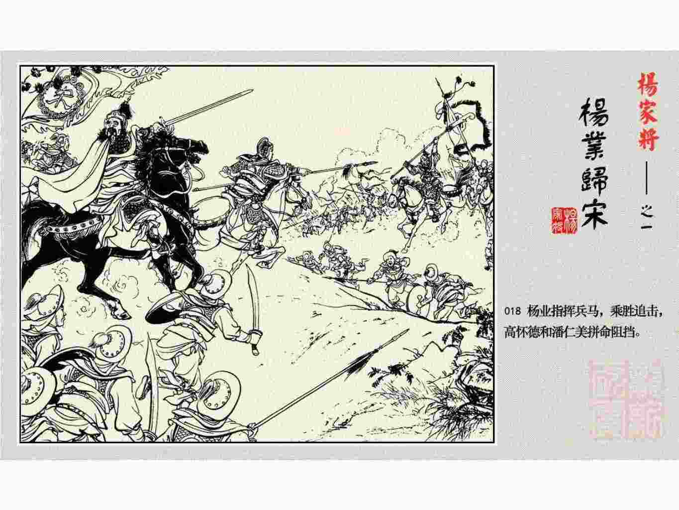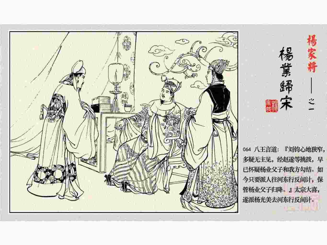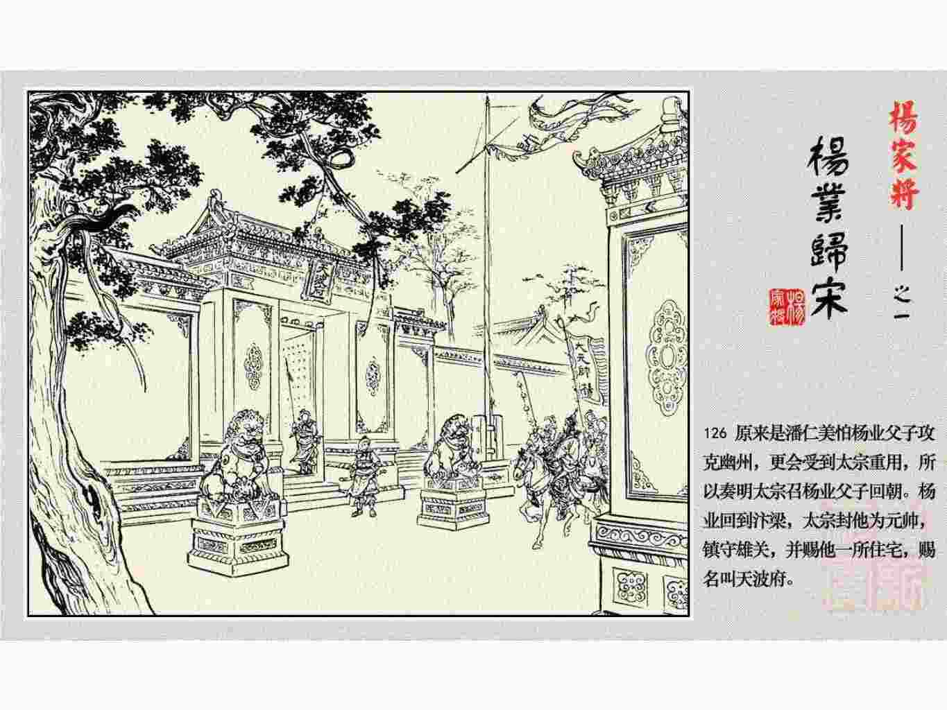 这套连环画是根据《北宋杨家将演义》和评书《杨家将》,并参考《宋史》中杨业、杨延昭、潘美等人传记,及京剧和地方戏曲改编的。全书分为五集。本集《杨业归宋》:杨业原是北汉王刘钧部下的武将,曾和宋朝作战。刘钩听信宠臣的谗言,对杨业不予重用,而宋太宗却十分赏识杨业父子,派人劝说杨业归宋。最后杨业父子弃暗投明,归顺宋朝。下集《杨七郎打播》,讲潘仁美的儿子潘豹立插台仗势欺人,杨业之子杨延嗣打死潘豹,潘、杨两家结怨。本书1958年2月由朝花美术出版社首次出版,现经修订,重新出版。