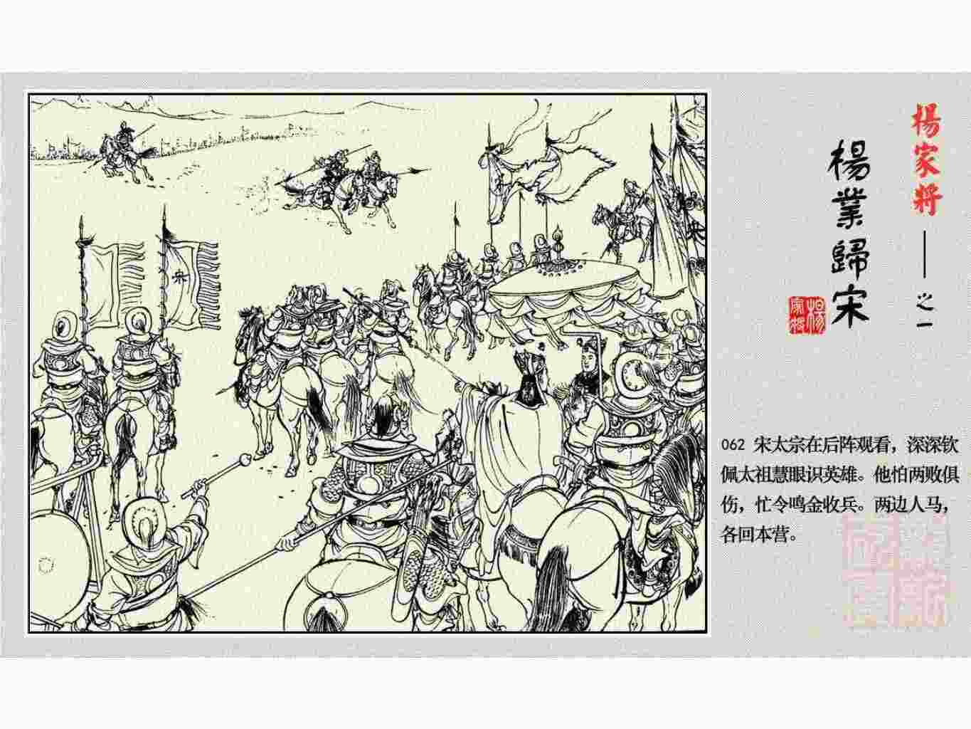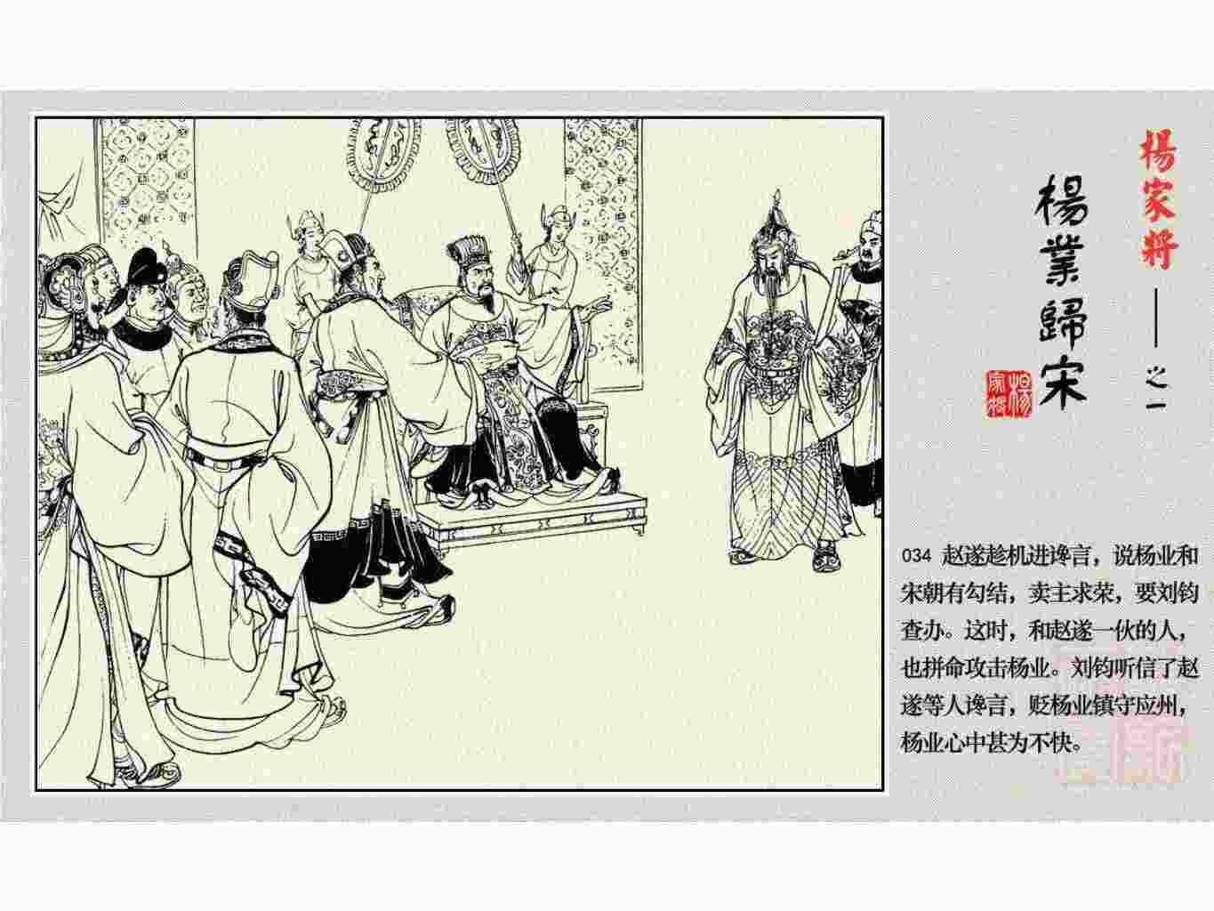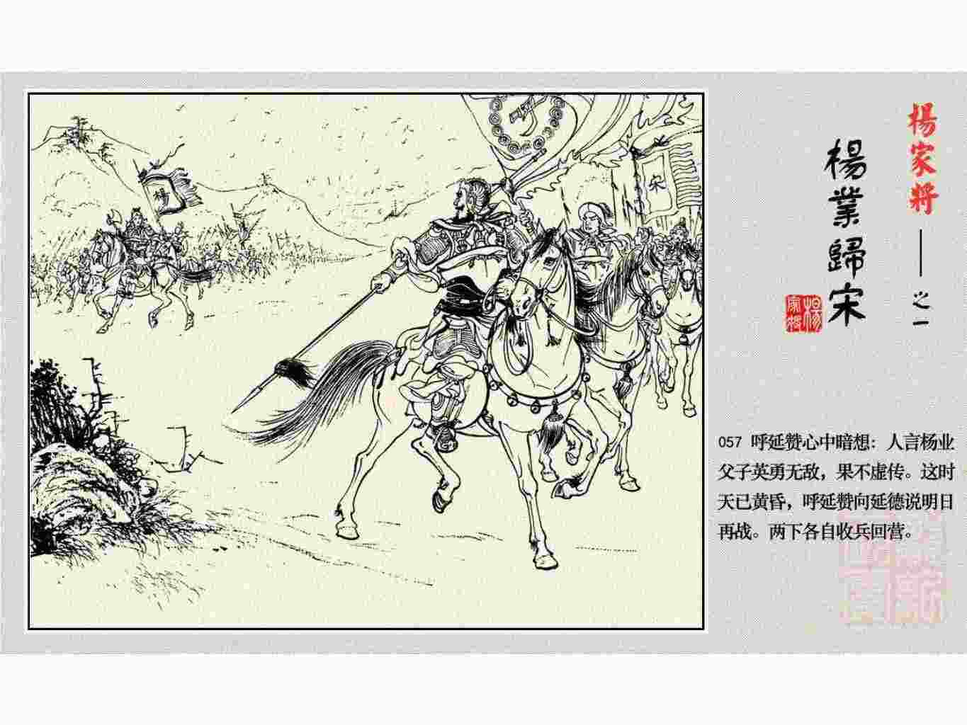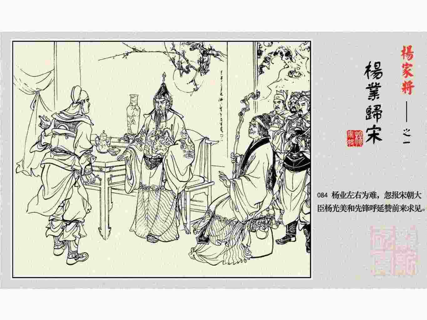 这套连环画是根据《北宋杨家将演义》和评书《杨家将》,并参考《宋史》中杨业、杨延昭、潘美等人传记,及京剧和地方戏曲改编的。全书分为五集。本集《杨业归宋》:杨业原是北汉王刘钧部下的武将,曾和宋朝作战。刘钩听信宠臣的谗言,对杨业不予重用,而宋太宗却十分赏识杨业父子,派人劝说杨业归宋。最后杨业父子弃暗投明,归顺宋朝。下集《杨七郎打播》,讲潘仁美的儿子潘豹立插台仗势欺人,杨业之子杨延嗣打死潘豹,潘、杨两家结怨。本书1958年2月由朝花美术出版社首次出版,现经修订,重新出版。