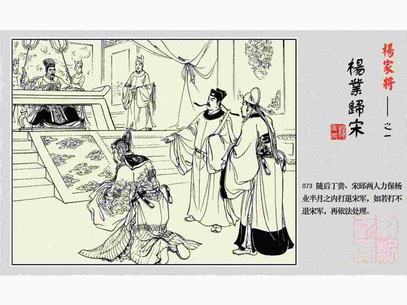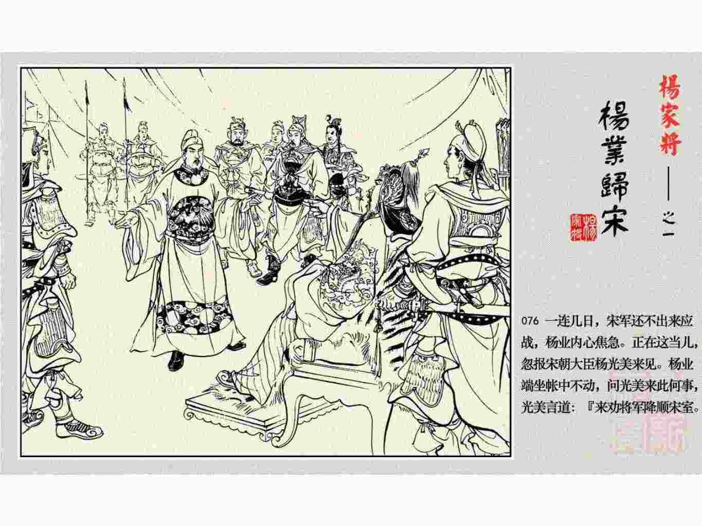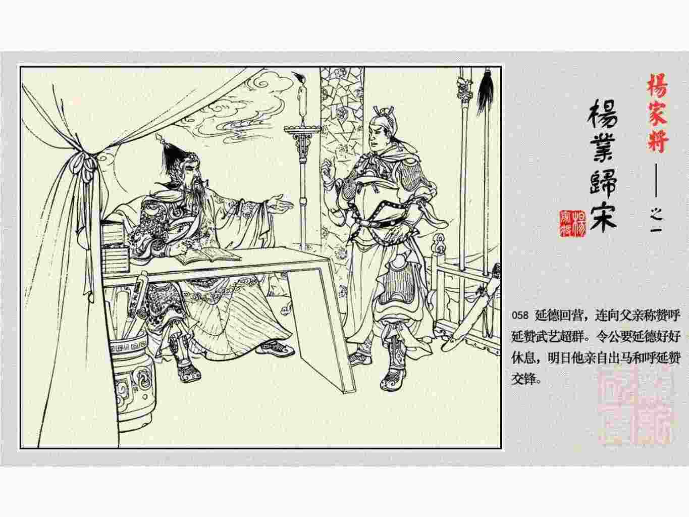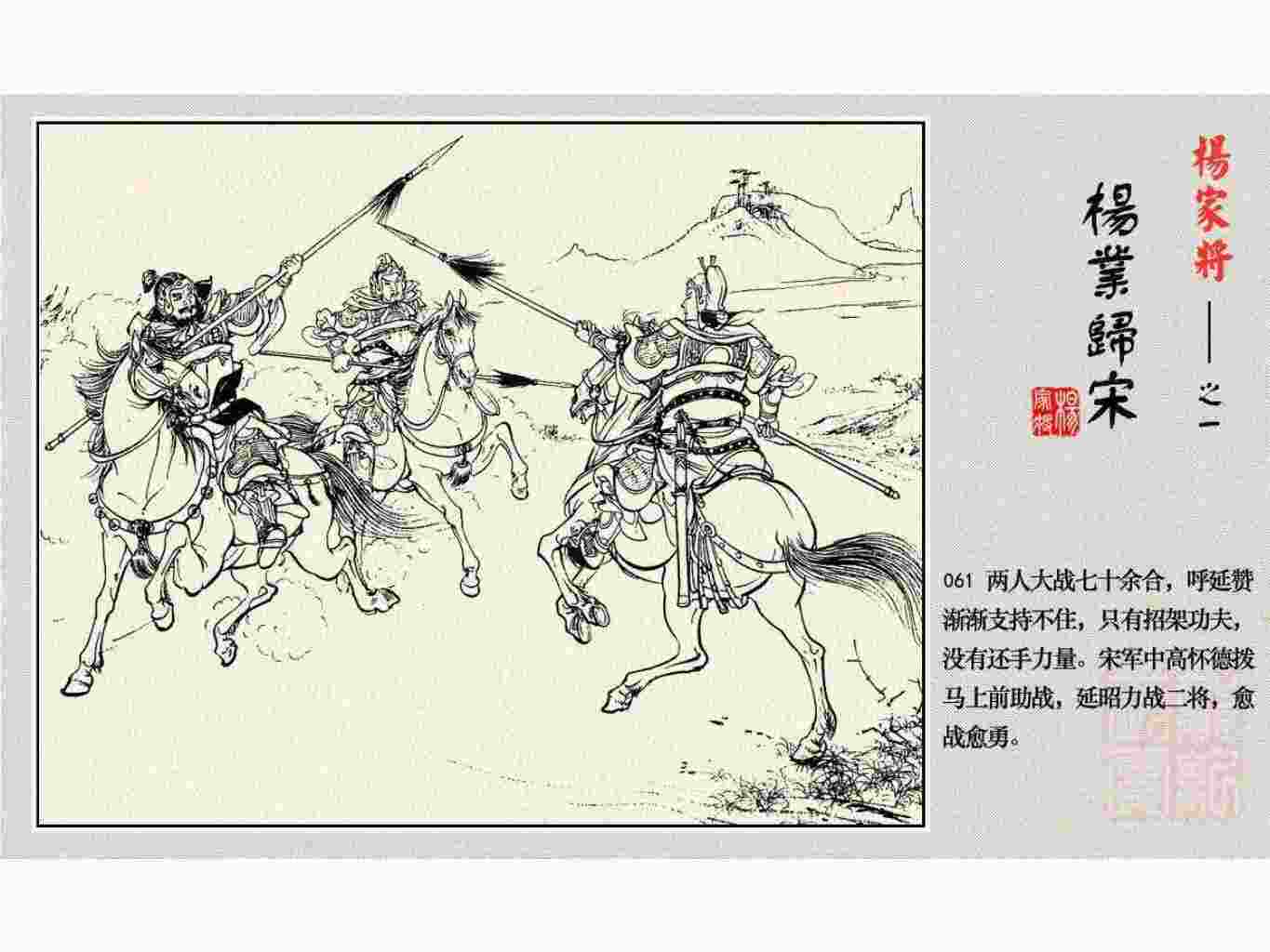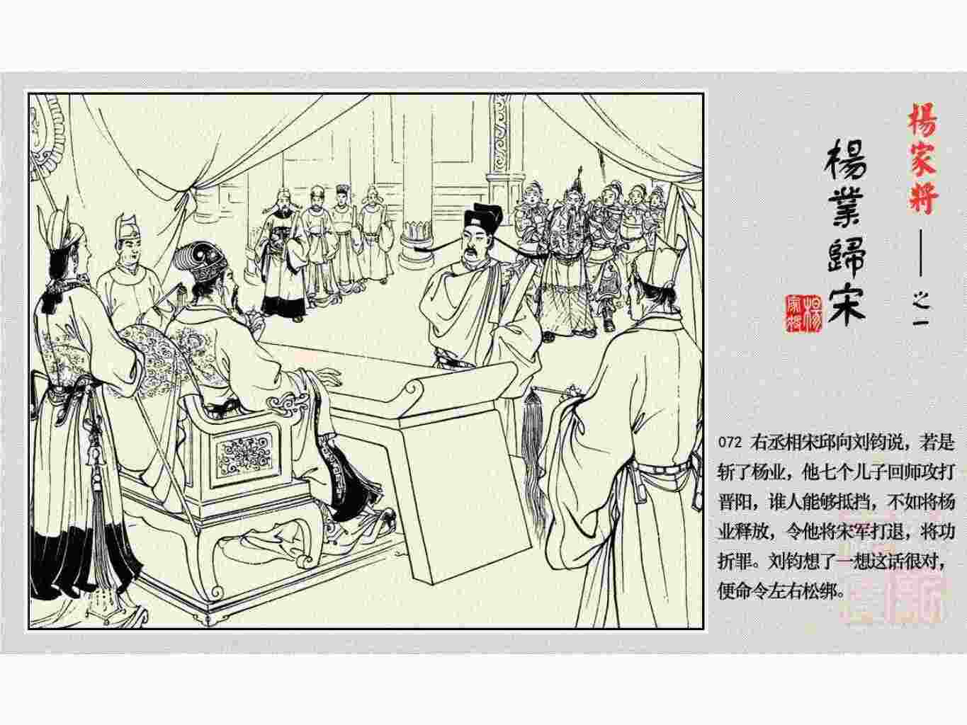 这套连环画是根据《北宋杨家将演义》和评书《杨家将》,并参考《宋史》中杨业、杨延昭、潘美等人传记,及京剧和地方戏曲改编的。全书分为五集。本集《杨业归宋》:杨业原是北汉王刘钧部下的武将,曾和宋朝作战。刘钩听信宠臣的谗言,对杨业不予重用,而宋太宗却十分赏识杨业父子,派人劝说杨业归宋。最后杨业父子弃暗投明,归顺宋朝。下集《杨七郎打播》,讲潘仁美的儿子潘豹立插台仗势欺人,杨业之子杨延嗣打死潘豹,潘、杨两家结怨。本书1958年2月由朝花美术出版社首次出版,现经修订,重新出版。