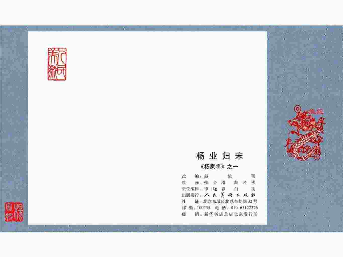 2527《杨家将》人民美术出版社,该套书于五、六十年代初版,1981年2版出版发行,共5册,分别是《杨业归宋》《杨七郎打擂》《双龙会》《李陵碑》《智审潘仁美》。绘画作者是张令涛、胡若佛;这套书收藏价值较高,但由于版次、印次较多,较难收齐如意的版本。后出32开本又补三册《威震三关》、《大破天门阵》、《穆桂英挂帅》。本次梳理不加入后补的三册,在其他版本中间接插入,以表示对经典的重视。
